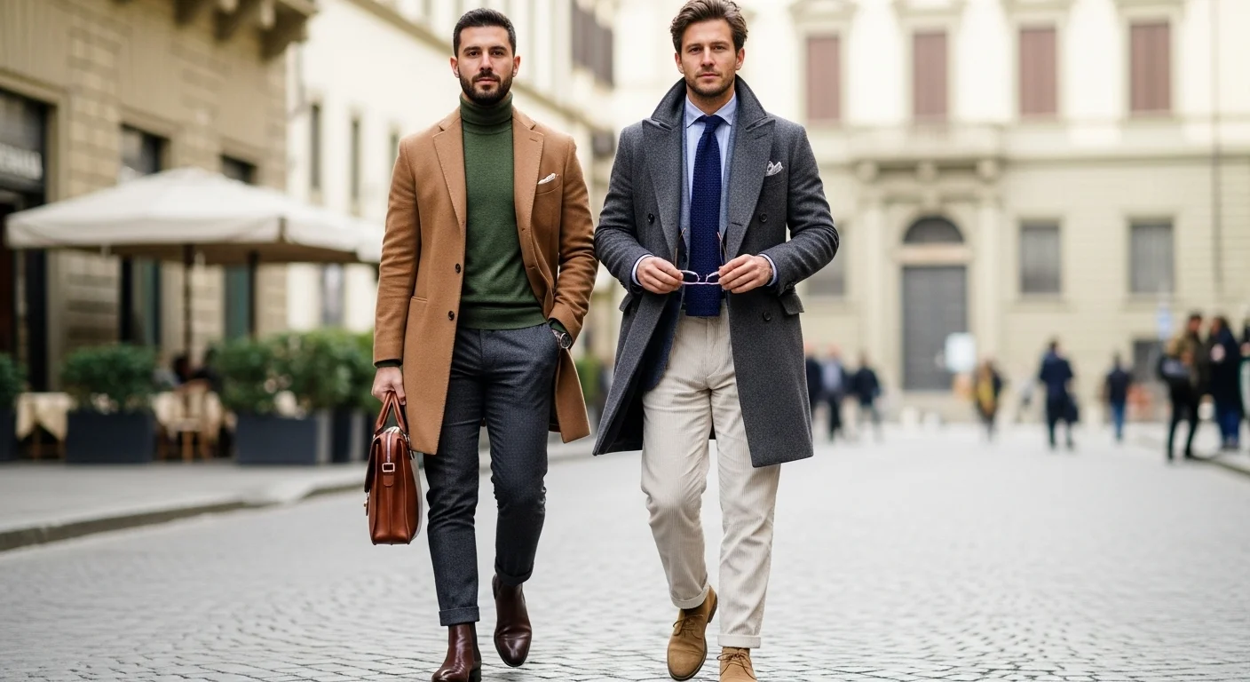 A tailored wool overcoat layered over a suit creates a refined, classic winter look. Italian men often choose neutral colors like charcoal, camel, or navy to maintain versatility.