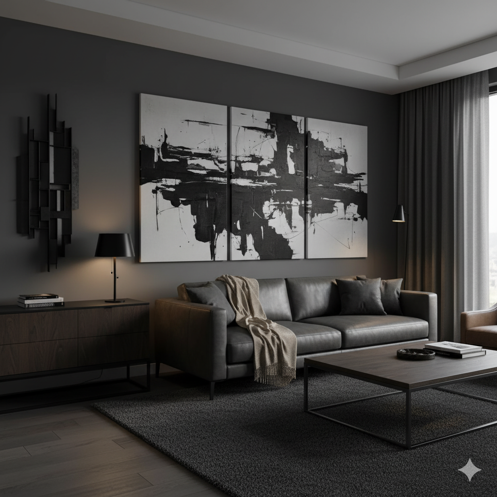 One large, bold artwork creates impact far more effectively than a cluttered wall of small prints. An oversized canvas — perhaps a moody landscape or abstract geometric piece — anchors the room and radiates confidence.