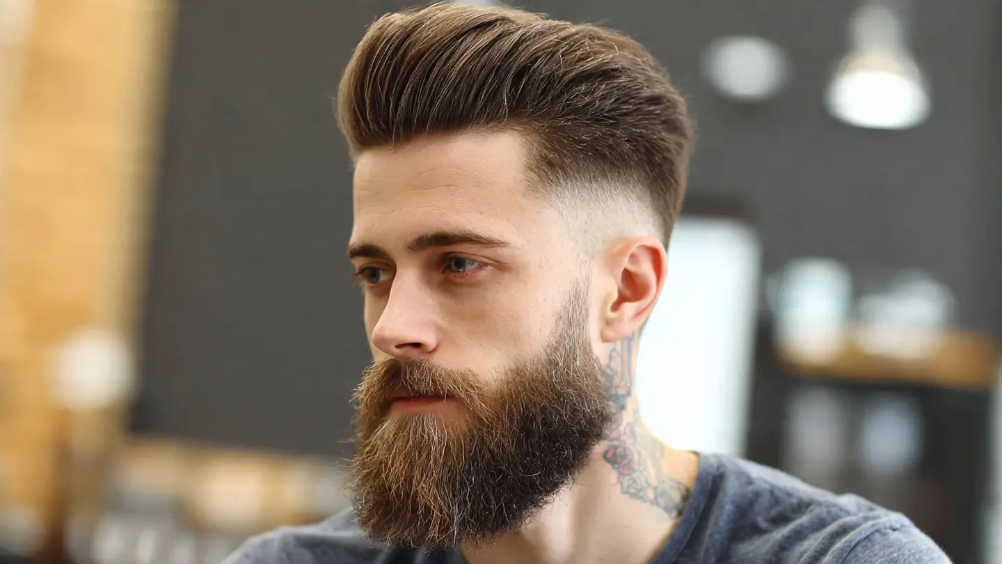 Pairing a pompadour with a neatly trimmed beard enhances masculinity and reflects modern beard styles for men that complement structured haircuts. The height on top complements jawlines and adds sophistication.