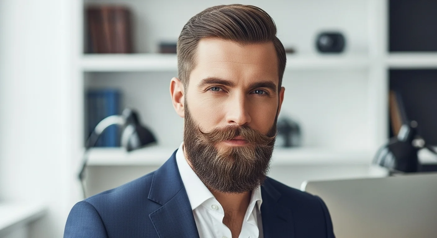 A full beard with a light taper along the sides balances thickness with refinement. It’s professional, versatile, and works in both casual and formal environments.